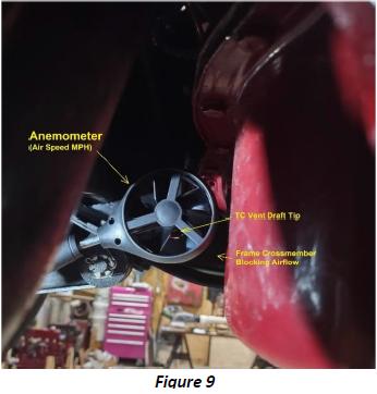 Just like the windshield blocks you from wind while driving, the front valance and crossmember blocks wind from the vent tube. It sees only 10% of the full, main air stream (figure 10) and its max capability (-0.07wc) is barely equal to the minimum air filter vacuum. Perspective; it’s much less than normal human breathing (0.30 to 0.55wc).