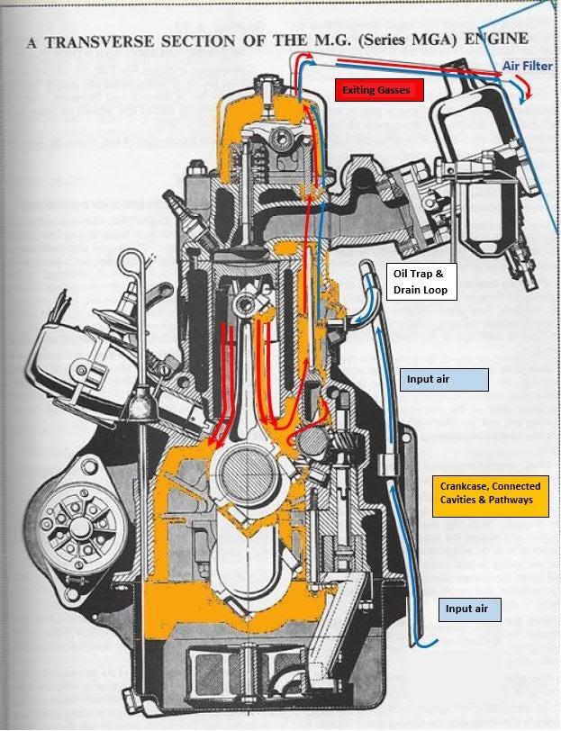 The combustion chamber typically reaches around 1,200 psi and can reach over 2,000 psi on some engines. This very high pressure, causes combustion gasses (blow-by) to push by the piston rings adding pressure to the crankcase twice every revolution (engine synchronous). The resulting flow and pressure in the crankcase is small but still tends to push oil past seals and gaskets. The blow-by also contains carbons, hydrocarbons and water vapor, all of which can contaminate the oil and harmful to engine internals. On the MGA, the rear of the crank is open to atmosphere so any pressure will push oil out. This pressure needs to be released and gasses vented to prevent pressure buildup and engine damage.