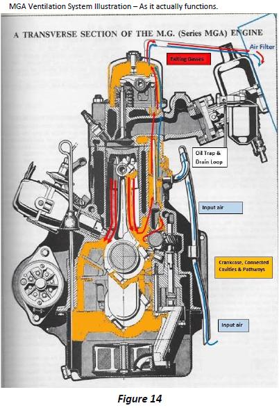 Like the MG T series, the MGA system (figure 1) has two vents, one from the rocker cover (RC vent) into the front air filter but the tappet cover vent (TC vent) was intentionally, reduced in diameter by ½ , moved forward behind the crossmember and