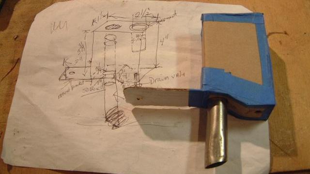 "So here's what I came up with. I made a cardboard mockup, after measuring everything. The "in" pipe will be the existing draft tube, without modification. I will use a small length of 3/4" copper tube for the new draft tube. I drew a rough sketch, then cut out the cardboard".