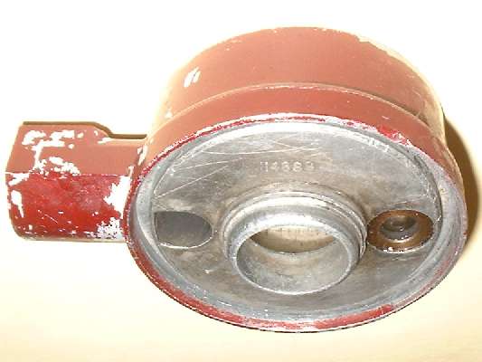 There is a three step pilot spigot in center of bottom side. The first shoulder is 1-15/32" diameter x 7/64" high. Second shoulder is 1.365" diameter x 5/64" high. The final shoulder is 1-9/32" diameter x 3/16" tall with a rounded edge (pilot diameter for the filter element). The splash plate is 1.375" ID x 2-13/16" OD(+/-) x 0.036" thick (20 gauge). The plate sits on the first shoulder with nominal 0.010" diametrical clearance for easy assembly. The second shoulder is then swaged (pushed down) about 1/64" with a tubular punch to shorten and expand it in diameter to make a tight fit to hold the splash plate in place (essentially riveting the second shoulder over the inner edge of the splash plate). This provides a 7/64" relief space between the plate and head for oil flow. Looking closely at the picture above left (click for larger picture) you can see where a portion of the second shoulder was broken away in process of removing the splash plate.