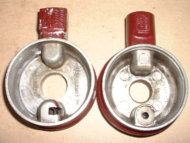 Two piece oil canister adapters. Above left, late Tecalemit and Purolator tops. Notice the spring loaded pressure relief bypass valves. Above right, late Tecalemit and Purolator bottoms (with splash plates removed) showing bypass valves. Below left, late Tecalemit and Purolator seal glands (same groove dimensions). Below right, late Tecalemit and Purolator markings.