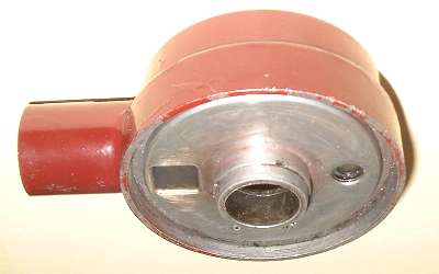 Here are pictures of bottom side of the original Purolator filter head with and without the splash plate. There will be 3/32-inch space between the splash plate and the bottom flat surface of the filter head. Oil enters at the long projection port on the left, passes downward through the square hole, then passes outward between the head and plate, then down around the outer edge of the splash plate, then radially inward through the filter element, and finally upward through the center hole into the engine block. The smaller round hole on the right side is the passage to the pressure relief bypass valve (in case the filter element may be clogged enough to not pass the full flow of oil).