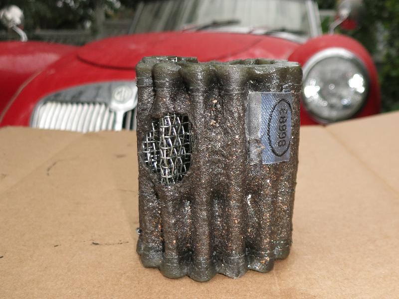 "The above picture is the second filter that disintegrated for me. I had my ’58 MGA on-the-blocks for several months in 2016. Prior to re-start, I decided to change the oil because it had been 2K miles and the oil looked very dark. Upon pulling the filter, I found it 90% destroyed and 1/2 teaspoon of metal filings were sitting in the bottom of the oil filter canister. After consulting with others, I installed a new felt oil filter, fresh oil and cautiously drove the car. This engine had been rebuilt 5 years and 13,000 miles previously. After 75 miles of driving on the fresh oil & filter, I became alarmed by extremely low oil pressure. I pulled the pan and found more than a tablespoon of metal filings and once again a mostly shredded oil filter (picture above). It’s very hard to say what the sequence of events were inside the engine, yet upon tear-down the main and rod bearing were seriously eroded with evidence of metal filings passing through. In closing, for me, it’s no more felt filters".