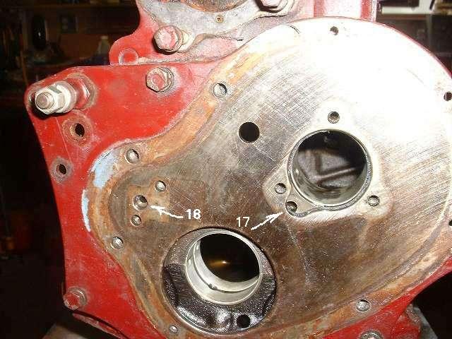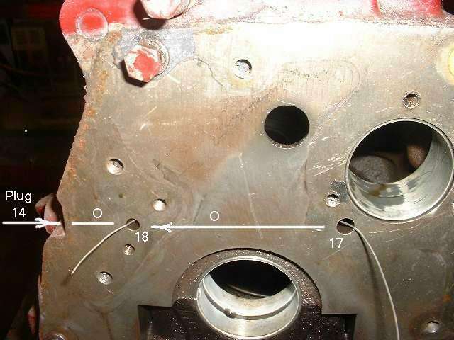 Low on the right side of the block just behind the front plate (engine mount area) is a press fit plug 14. Hard to see in this picture, it is a small flush fit plug within the visible depression. This plug closes a cross drill hole which supplies oil from the front cam bearing to the timing chain tensioner. Item 15 is a slotted screw plug at the sump flange. This is a dipstick port for other engine applications.