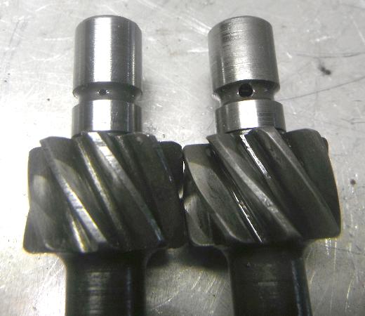 In the picture of the gears you may notice the radial holes are different size. That may be a simple manufacturing convenience. Oil flow here is restricted by small radial clearance in the bearing journal, so size of this oil supply hole should not matter. The gear on the right shows considerabe wear on the gear teeth (click for larger picture).