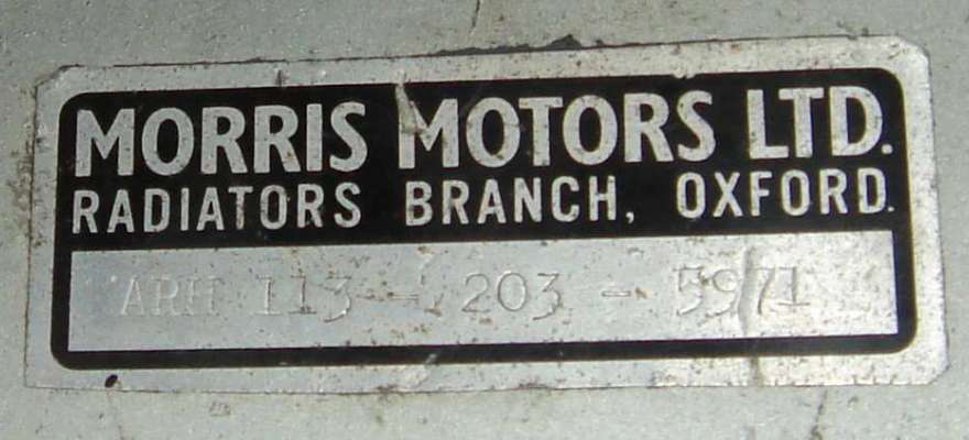 10-rows of oil channels, bottom flange mount, and bottom ported (click for larger picture). This one is stripped bare aluminum, but I believe they were originally painted silver-gray. There was originally a "Morris Motors Ltd. Radiators Branch, Oxford" stick-on label on top showing Drawing number, Issue number, and Serial number, as shown here.