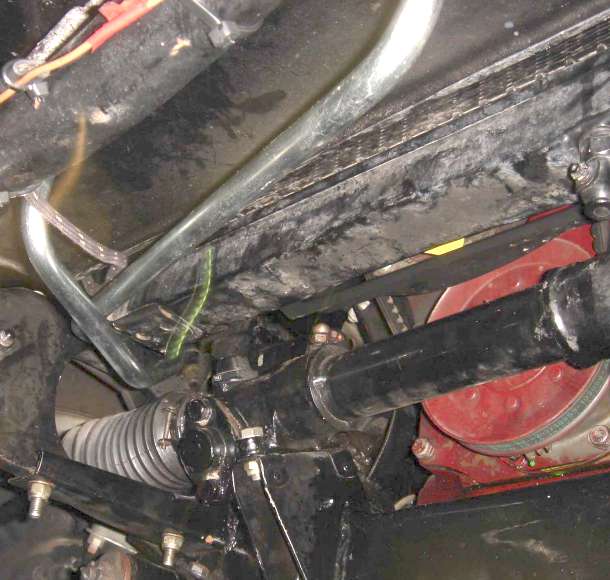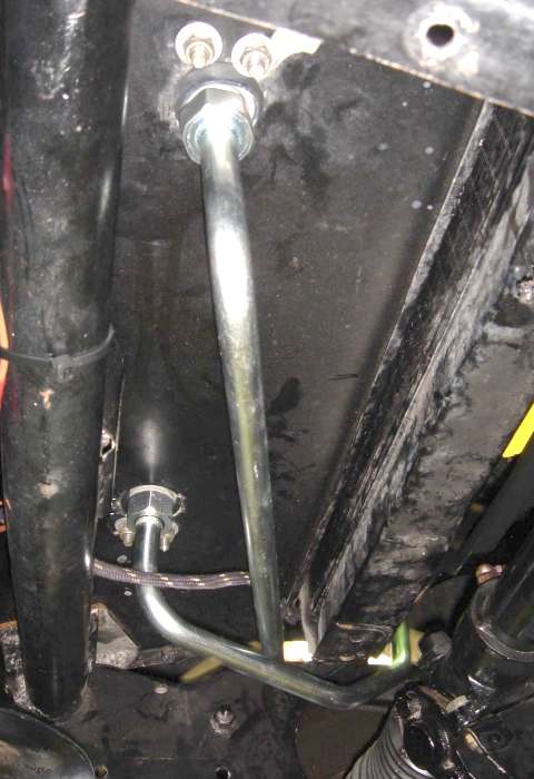 Photos above and center show the original factory type oil pipes below the air pan. Notice in center photo at bottom of picture the notch in the front frame extension where the OEM style top mounted anti-sway bar would mount. This shows why the oil cooler is installed so far forward from the radiator, as the steel pipes must pass in front of and then below the sway bar. Photo above right shows the pipes passing around the right side of the radiator lower tank.