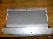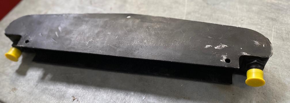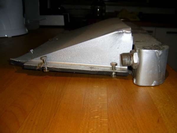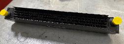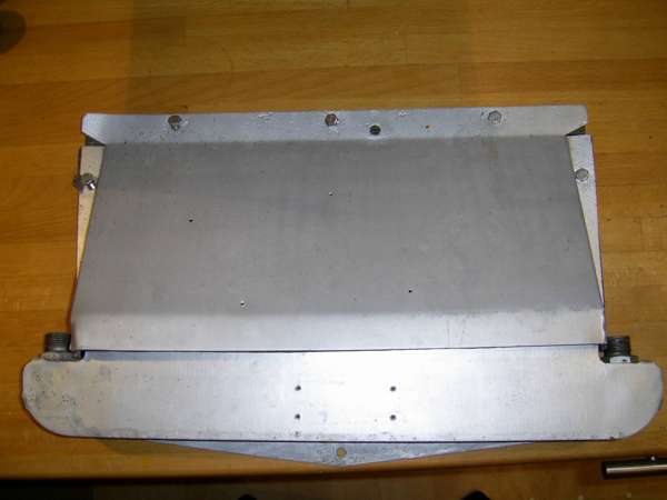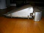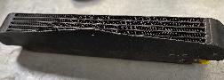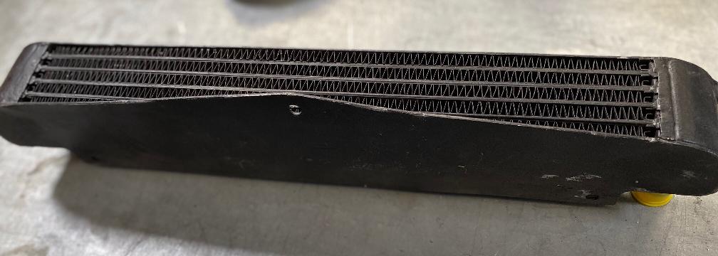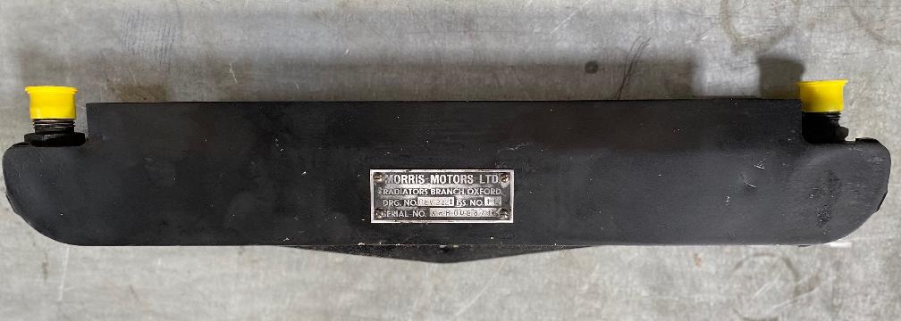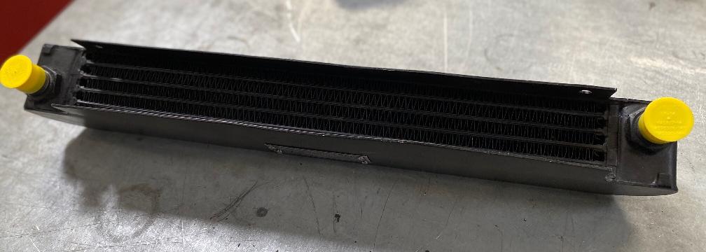 The following photos from Colyn Firth in South Yorkshire, UK, show a unique adaptation of the factory type competition oil cooler. The sheet aluminum after duct is well made but appears to be hand formed with irregularly spaced holes (hand drilled for installation). On the cooler there are self-tapped holes where the factory tag was fitted with screws as original.