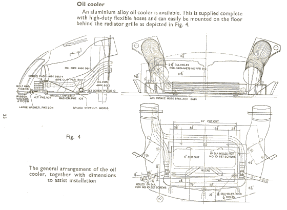 "I have attached page 25 from the 1958 Special Tuning manual showing the mounting instructions for this oil cooler. It shows the air intake ducts mounted on small pedestals to clear the wide oil cooler - these pedestals were still on 554 when I acquired the car. .... I have seen this oil cooler mounted on 2 other MGA's in South Africa".