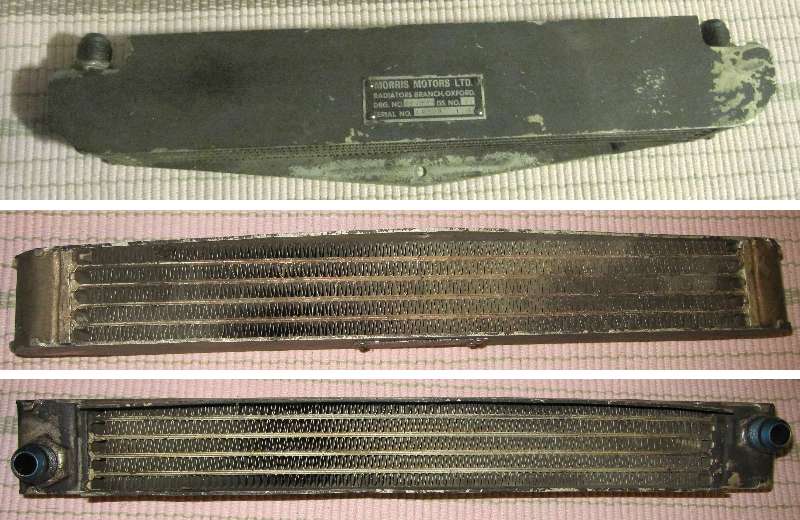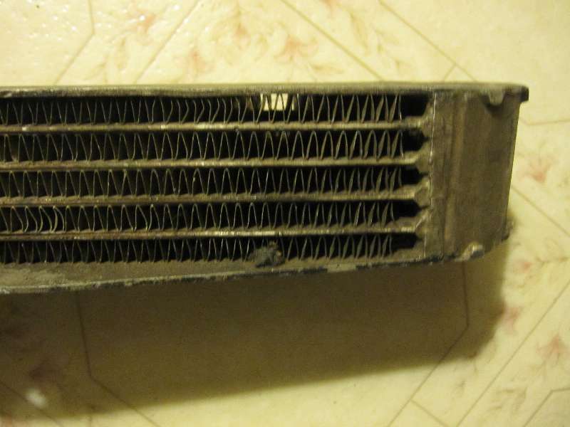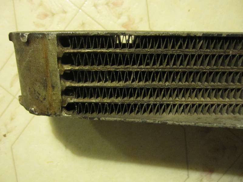 Photos from an eBay ad: Four row oil cooler. These appear to have no fluid channel at top and bottom.