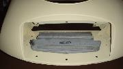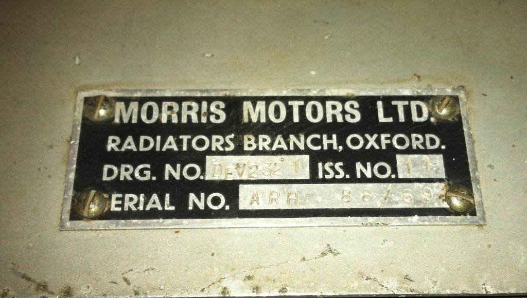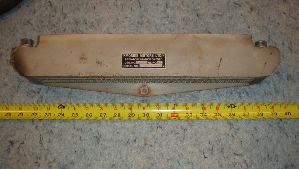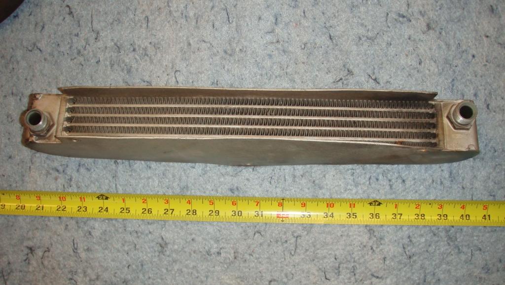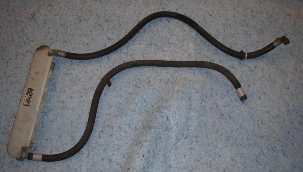 A hole, similar in placement and size described in Barney's article was cut into the radiator duct panel. The hole was crudely cut with a torch. The oil lines are not the stock steel lines, they are rubber 1" OD. The way the fittings are attached they were manufactured, not home made. The line with straight fittings runs from the oil filter base to the cooler. Stamped on the fittings is AEO I9844 ISS5 YA 1402 (this is likely the fitting part number). The line with the 90 degree fitting on one end runs from the rear of the block to the cooler. The straight fitting on this line is marked the same as the other line's fittings. The 90 degree fitting is not marked. A band on the hose is marked PT WDH 103B/44-43 AHH 5612 12/57. The air scoop is aluminum with nice looking welds".