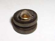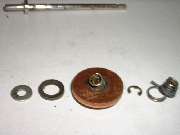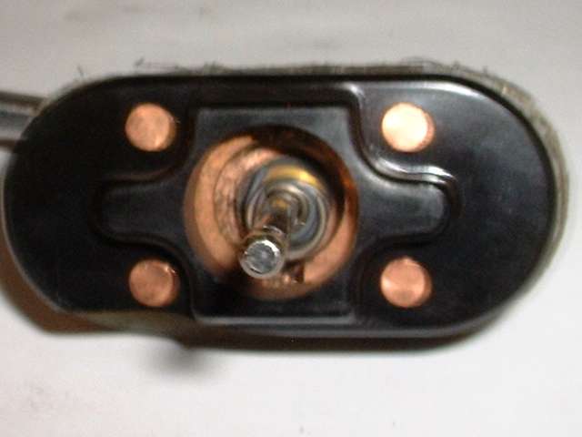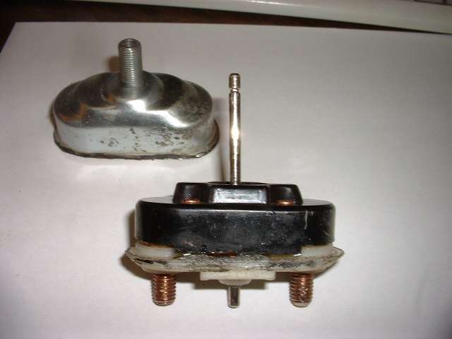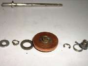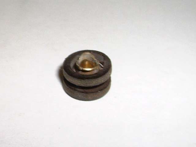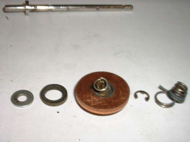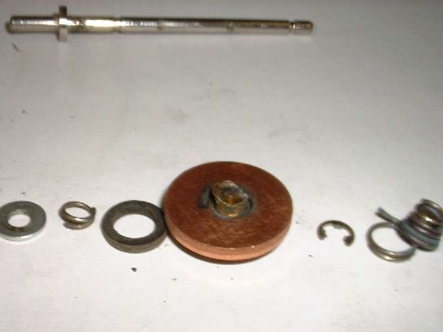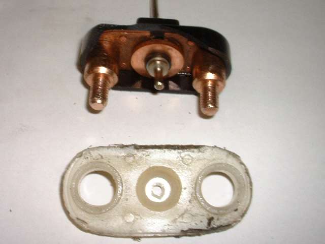 "First (as you can perhaps see in the photo) there is an insulating ring on the lower side of the disc and shaft which insulates the disc from the shaft. On this one, as I pulled on the disc (disassembled) the rubber insulator pulled away from the disc and left it loose. Seems to have been glued to the inner insulator. It will go back into place easily, but will not stay, and the disc is now loose from the shaft. Not sure how this was designed to withstand the forces of pulling against the disc and spring w/o pulling loose. If I were to redesign, I would add a thin washer between this insulator and the rear spring which would prevent pulling the disc loose from insulator. I will say that even after my use on the car, it was still intact, per se, and allowed the disc to move slightly to align to the base contacts.