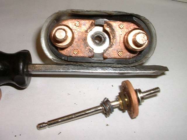 In operation the heavy copper disk must remain at all times electrically isolated from the central pull rod and spring (or springs), such that the disk will only find electrical connection with the two fixed contact bars in the phenolic case. Inspection of the moving parts reveals that the copper disk is mounted on a central fiber insulating ring and flanked by two flat fiber washers, which should electrically insulate it from the central spindle and from all other surrounding parts. The key word there is "should".