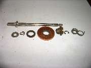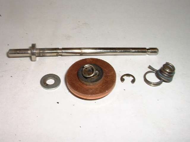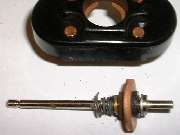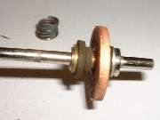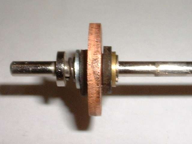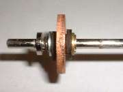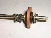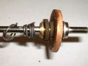 In front of the forward fiber washer is what first appears to be a thin brass washer with close fit on the shaft. This is in fact the forward flanged end of an eyelet, or tubular rivet. This eyelet has a close sliding fit on the shaft, and is about three times as long as the shaft diameter, therefore allowing it to slide on the shaft without cocking or binding. A small snap ring in front of the eyelet fits into a groove in the shaft, effectively retaining the fiber insulator and copper disc assembly and preventing these parts from moving forward on the shaft. Behind the insulator assembly there is a flat steel washer with a close fit on the shaft, and behind that a rigid shoulder on the shaft which is an integral part of the shaft. These parts will prevent the insulator and copper disk assembly from moving any farther back on the shaft. So with these parts in place, when the shaft moves fore and aft the electrically isolated copper disk will move with it.