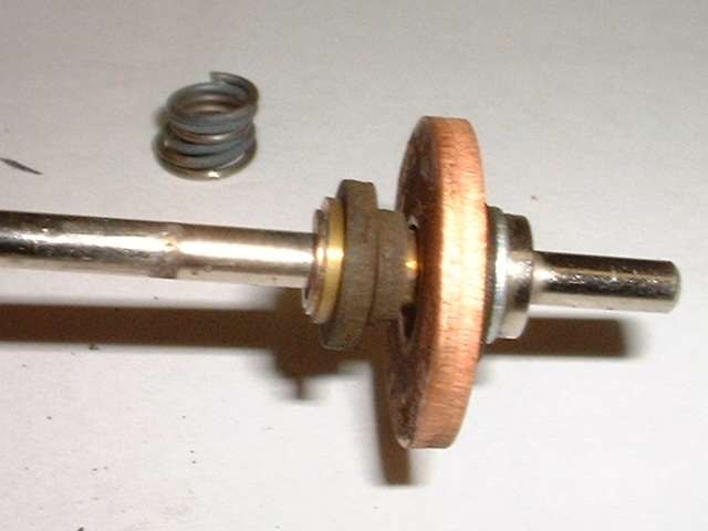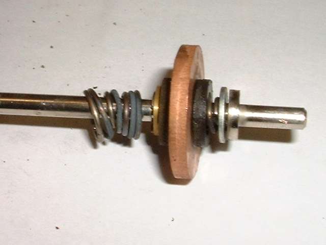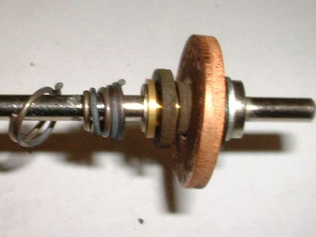 Now turn your attention to another small coil spring immediately in front of the steel washer but behind the fiber insulator assembly, best visible in the picture at far right above. This appears to be in the wrong place. I believe it should be positioned in between the steel washer and the flange on the shaft, such that it would hold the steel washer firmly against the insulator assembly, which would in turn keep the flat fiber washers in intimate contact with the copper disk, at all times, and the insulator assembly also pressed forward against the front flange of the brass eyelet. All of the parts from the small brass eyelet back to the small steel washer would then be free to move fore and aft in different circumstances while always remaining forcibly sandwiched together by the springs on either side.