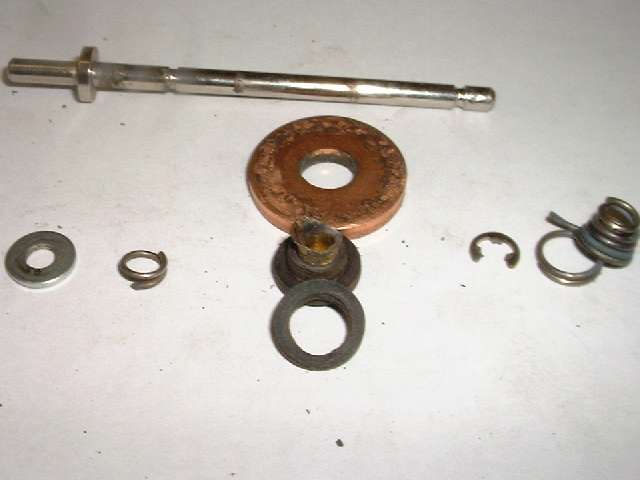 Now that we understand how the switch is supposed to work, we still need to find out what went wrong. Looking at the first picture above left, we can see that with a small nudge the large copper ring can fall off of the inner insulating ring and into contact with the eyelet. This of course should never happen, and we need to determine why the rear spring is not holding this assembly together. So now it's time to remove the snap ring and disassemble the parts from the shaft. From here on the parts are pictured with the reward parts to the left and forward parts to the right. The first picture above with loose parts (second picture from the left) shows the parts in the same sequence as they were removed from the spindle.