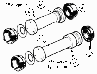 See figure at right. The aftermarket type piston has all ridges with about the same OD, and the narrower seal fits between the first two ridges. The OE type piston has a smaller ridge a little distance in from the end, and the wider EO seal fits over that ridge.