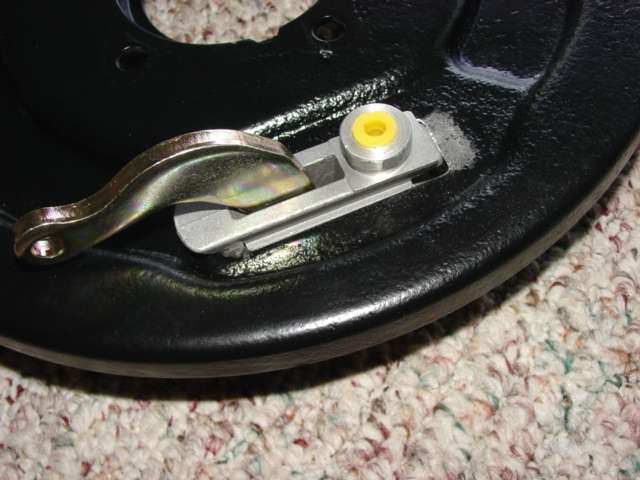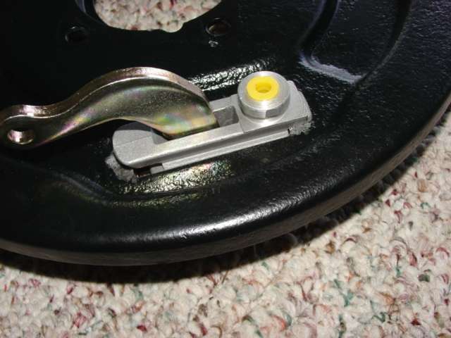 In photo above, space between the two white lines is a bit too narrow so the part does not fit on the brake backing plate. Photo below left shows the part that doesn't fit at top, and another part that was removed from the car (did fit). Red arrows point at the area with different dimensions. Photo below right shows Adam's solution, filing the surface that mates against the outboard side of the backing plate. Seems to me it may be easier to file the opposing surfaces (inboard side of the backing plate) across the ends as pointed out by white arrows in photo above.