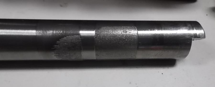 I just pulled this one out of my own gearbox. The base diameter is 0.645 as it should be. The worn sections are from front (right) to back (left), 0.639, 0.641, 0.634 diameter. Obviously gone completely through the "hard" surface and spalling on the softer material. The mating bearings were the recently common 11-roller cage bearings.