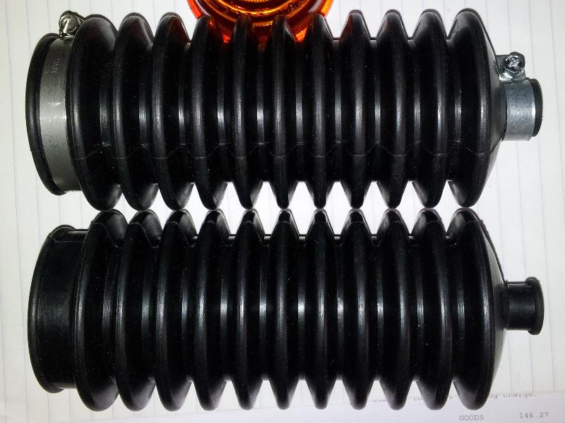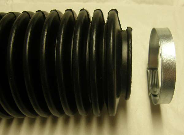 This is the convoluted "rubber" boot on the end(s) of the steering rack housing that must retain the gear oil inside the rack as the steering and suspension parts move. The current problem (March 2013) is that the grooves around the ends of the boot are too narrow to accept the proper clamps. The apparent solution is to use nylon tie-wraps to secure the boots on the steering rack. The tie-wraps must be quite tight to prevent oil leakage.