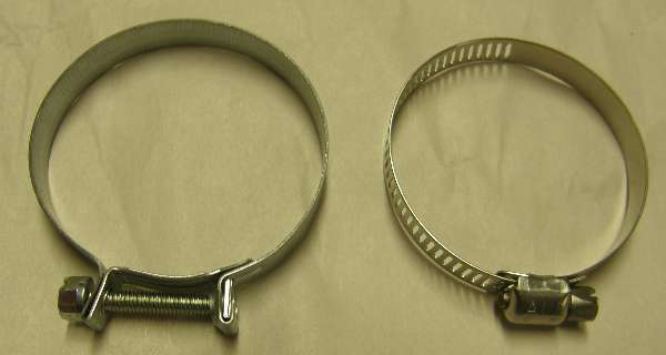 Original rack boots had wider grooves to accept the metal band clamps. Boot material was synthetic rubber (Neoprene) and was fairly thick and durable. Original band clamps were similar to the one shown on left in the picture. The square nut was a little thicker; the bent over tab securing the square nut was originally a 90 degree bend; the original machine screw was Phillips slot round head (most likely), or possibly slotted pan head. Original clamps were same width but different diameter for opposite ends of the boot.