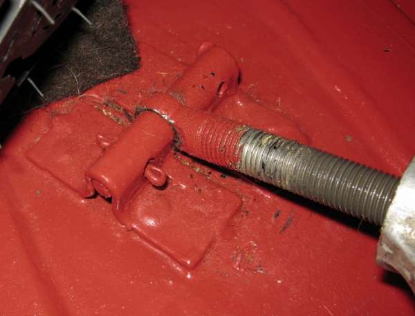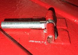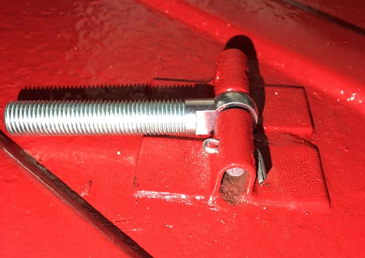 There are two pieces of sheet bent to form a "U" shape bracket in the middle to hold the pivot pin. These are spot welded through the boot floor to a stiffener plate underneath. A split pin passes through one of the brackets (they both have the hole) to secure the pivot pin. The pivot pin secures an eye bolt that the clamp fits onto, which is in turn secured by a flat washer and a wing nut. The pivot pin is originally 1/4" dia x 2" long with a 0.094" dia cross drilled hole 13/32" from one end (and using a 0.090" diameter split pin).