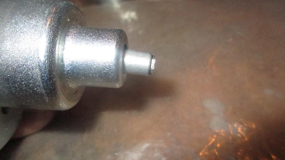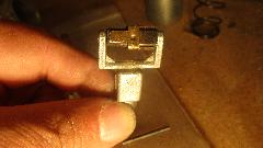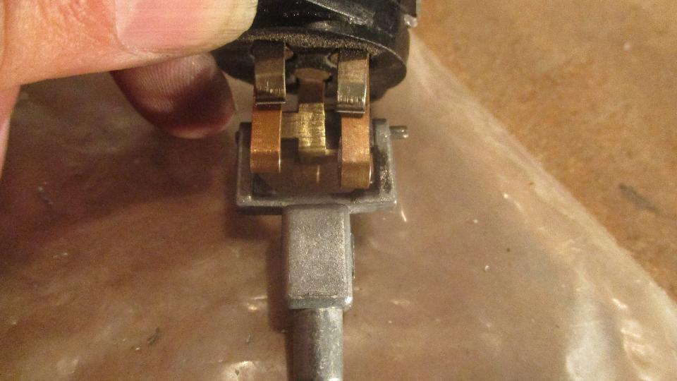 One of the contact fingers was curled up, like maybe the bobbin had over-traveled and caught underneath it before returning upward. The forked yoke with square shank was a very loose fit in the housing, so the yoke could wobble around a lot. The only thing restraining this wobble would be the step cap that was riveted to the top end of the yoke. In some combination of motion the yoke came into contact with one of the output contact fingers, resulting in short to ground on the housing (through the yoke), as witnessed by the badly burned contact and a mating burn mark on the yoke. Additionally, it looks like the ends of the square rotating bobbin may not be exactly perpendicular to the rotational axis, and the two arms of the yoke may not be exactly parallel. Result of all that is binding of the bobbin in the yoke at one point of the rotation. This binding point is illustrated in the picture where the supporting axle pin is lying on the table while the bobbin is still stuck in the yoke.