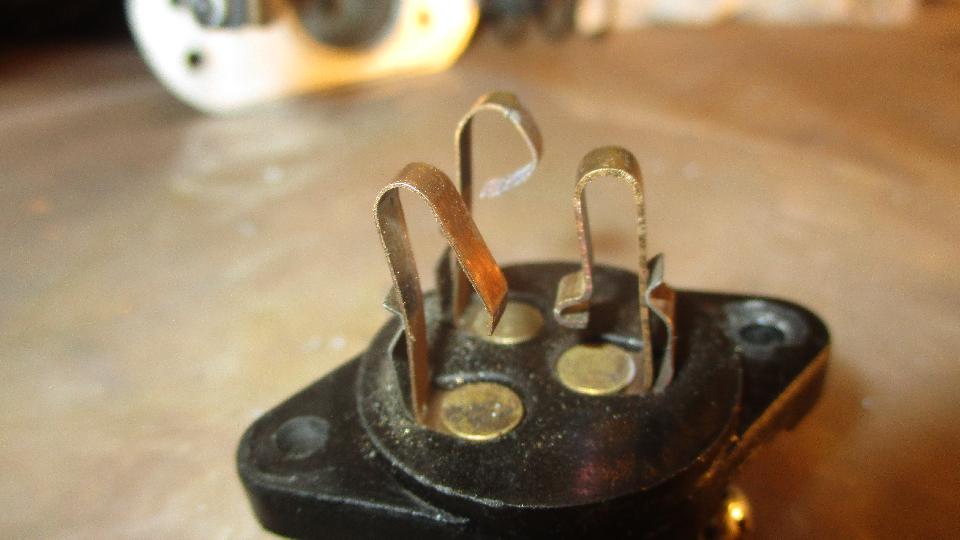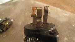 The moving parts are a forked yoke with square neck for alignment in the housing, and a rotating square bobbin carrying the moving electrical contacts. Fixed position parts are the pot metal housing and phenolic rear plate, and three phosphor-bronze spring contact fingers. The center finger is the power input terminal, and it has a hook at the bottom end. When the switch is kicked, the square bobbin is pushed downward where the hook catches a corner of the bobbin to make it rotate 1/4 turn, which in turn presents moving electrical contacts alternately to one or the other of the output fingers.
