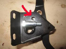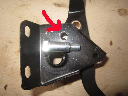Here the pivot for the throttle pedal is a shoulder bolt. The thread is 5/16-24-UNF, while the shank should be about 0.002" smaller than 7/16" nominal (0.4355"). Holes in the bracket need to be 7/16" on the left side and 5/16 (or a smidge larger) on the right side. This replacement part has the small hole on both sides, so the shoulder bolt cannot be installed. The field fix for this is to enlarge the hole on the left side to 7/16" diameter (drill or ream).
