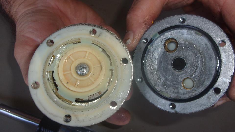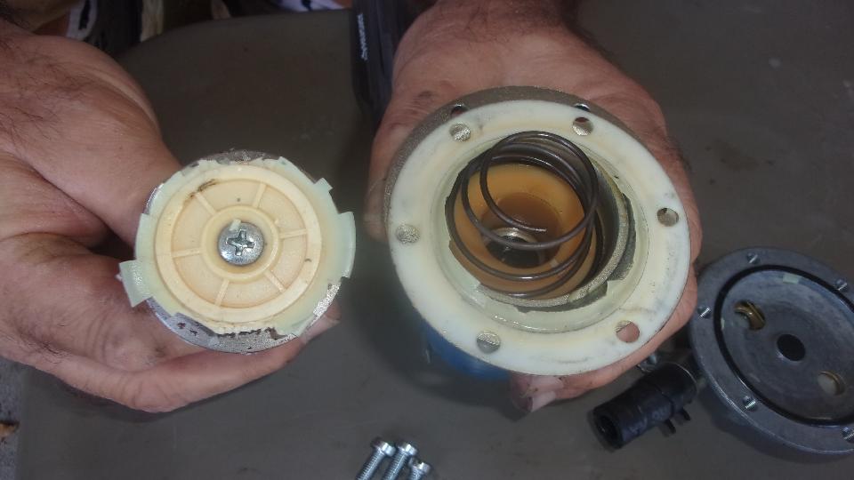 The part that is supposed to be a flexible diaphragm was molded with some kind of plastic, maybe Delrin (don't know)? But what should you expect when you put a thin piece of plastic in modern gasoline and let it soak for a few years? If you pinch this plastic part with your fingers it cracks and crumbles like a soda cracker. Boo, hiss, and shoot the designer who came up with that idea. I would be really PO'd if that thing failed without notice and left me stranded on the side of the road.