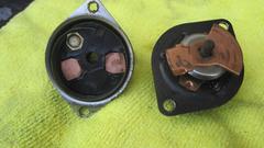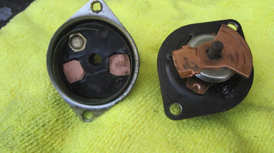The culprit here (I think) is the conical coil spring, which can be easily depressed with a simple pinch of your thumb. Apparently there is not enough spring force to make a reliable electrical connection to carry up to 200 amps current to crank a starter motor. In fact the final failure condition didn't even make a connection good enough to run the fuel pump or ignition coil, no electrical connection at all, even with repeated mechanical switching on and off. Maybe the contact plate was stuck on the square shaft so it could not be pushed down by the spring. Or, maybe plastic in the lower housing between the power studs was touching the contact plate to hold it up as not to touch one of the power studs. In any case, 100% electrical failure of every switch I've had in my car in the recent years is enough to recommend to the world at large not to buy these junk reproduction switches, guaranteed to fail.