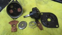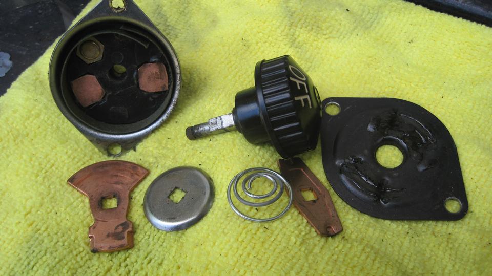 On February 27, 2024, I had half an hour available to dissect the failed "Lucas" branded battery cut-off switch. Drill out two eyelet rivets and remove one small E-ring in back to separate the housing. Inside you see the large copper (or brass) contact plate that rotates to make connections on the studs in the lower housing. It looks simple enough. Separate the moving parts from the front housing. From back to front we have the brass contact plate, a steel cup washer for nesting the large diameter coil of a conical coil spring, then the spring, followed by a brass detent plate, which provides the click stops at both extremes of rotational travel. Physically it works fine, but electrically it had no contact.