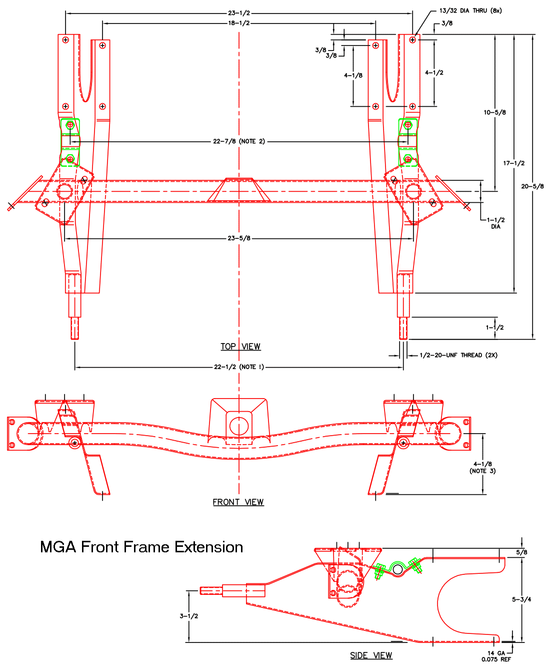 NOTE 1: Distance between the front threaded studs for bumper mount scales as 22-1/4 inches on my drawing, measured as 22-1/2 on one frame (probably straight) and 22-3/4 on another frame (probably bent). The exact original design dimension was not known when this was published.