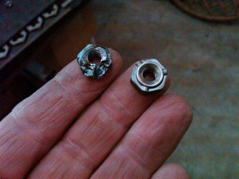 For a low power spot welder you can make three spot welds directly over the projections on the weld nut. A stronger spot welder could make the triple spot weld in one shot. That's what it looks like. Use a long bolt to wiggle the nut. If it breaks, do it over again. A right angle grinder with a small wheel does the trick for the grinding.
