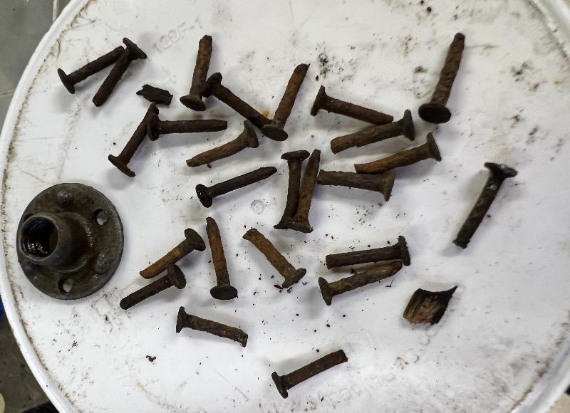 "Attached is a picture of the original t-nuts on my car. They were all attached with tacks that had their points removed. As you can see in the picture, none have any indication of ever having a point. I guess it's possible that they were long enough to protrude into the car and the seat rails flattened them when installed. The t-nuts are UNF, unlike all the replacements I've been able to find".