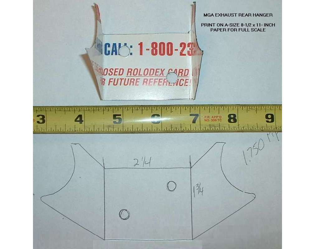 Someone needed to replace a rusted rear exhaust hanger once, so here is a template. Click for larger printable image. It should be very close to full scale when printed on A-size paper (8-1/2 x 11 inch) with minimal margins.