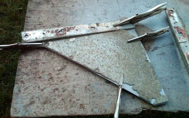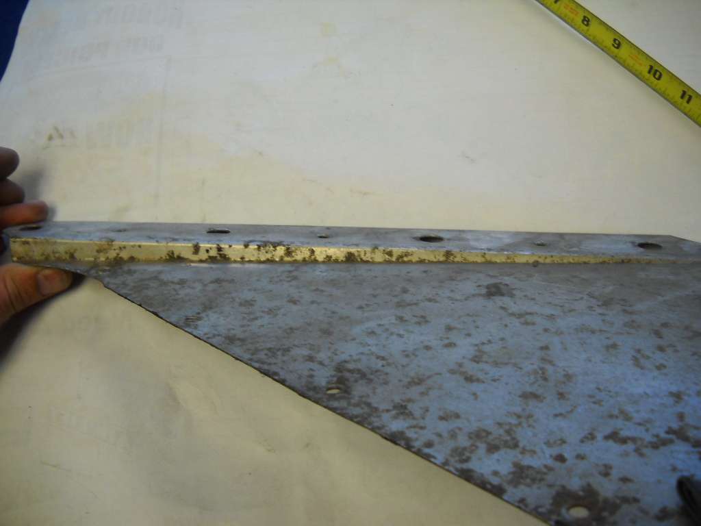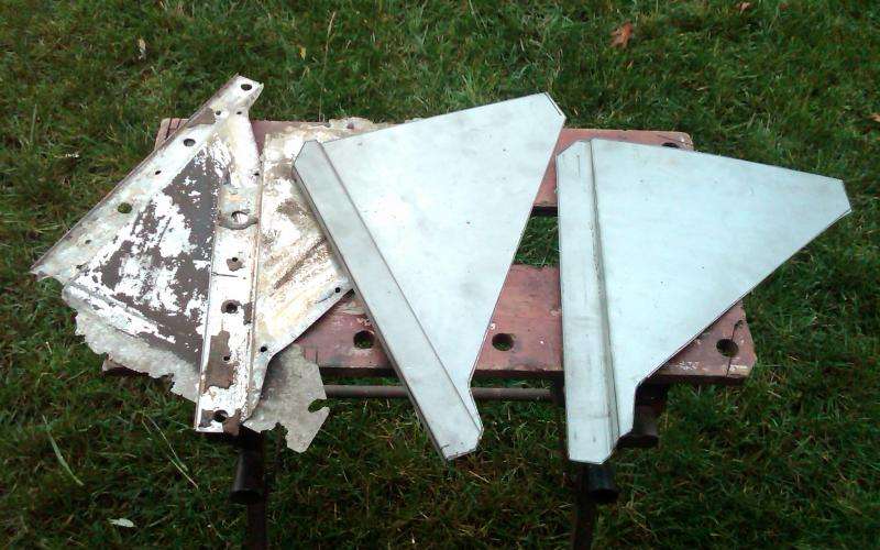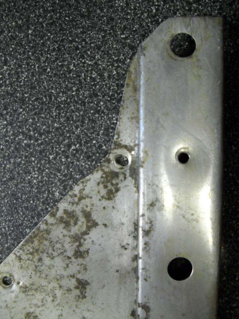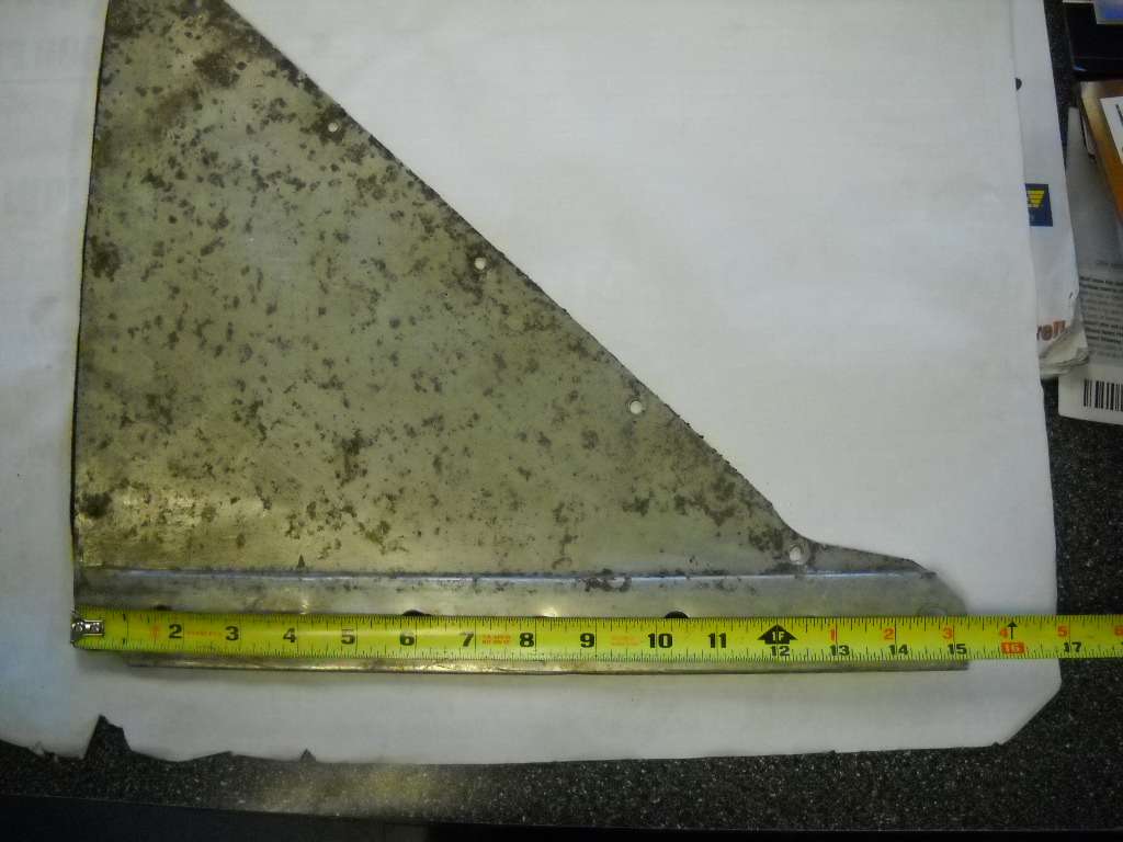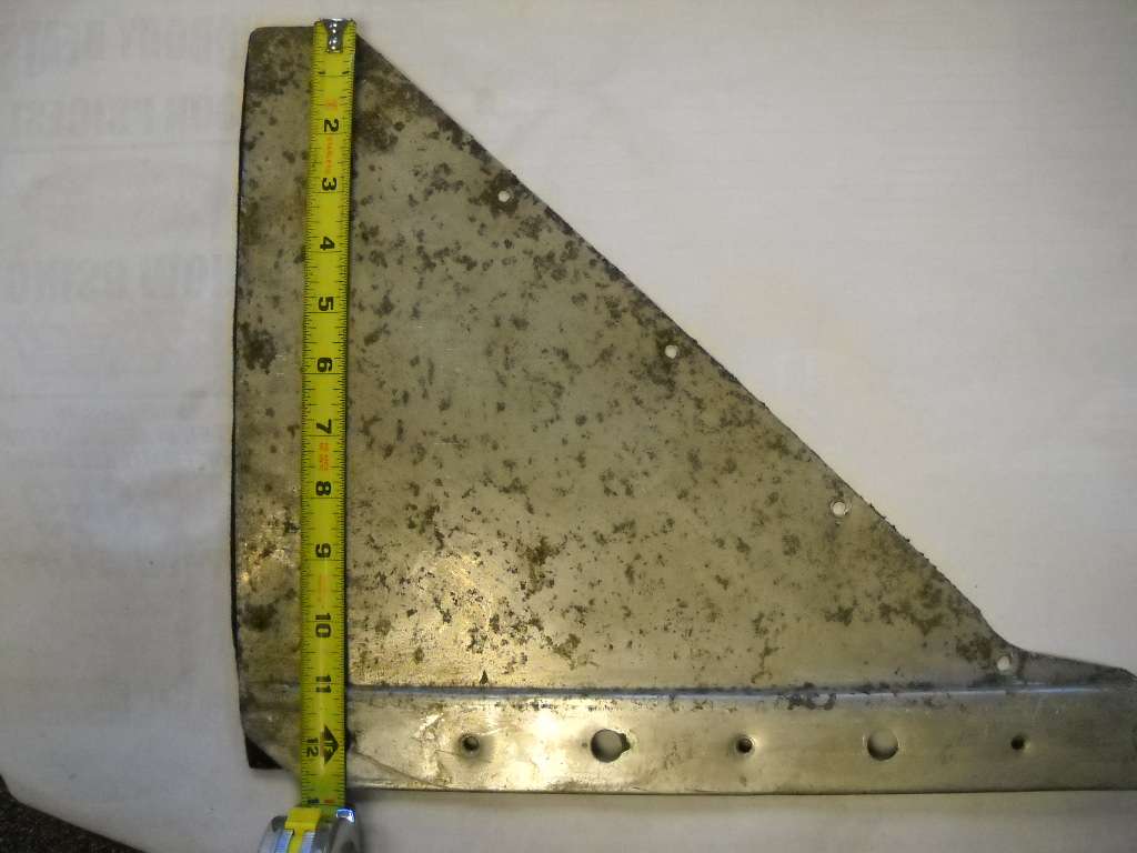 These closure plates are sometimes missing or corroded, and in need of replacement during restoration work. These are available as commercial replacement parts, but are also easy enough to make yourself if you have a bit of time available. The material is aluminum sheet with a channel formed along the front edge only to fit over the upright ridge on the fame goal post with four large clearance holes for the body to frame bolts (to be installed later).