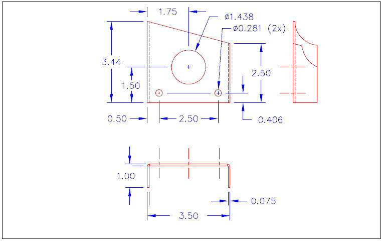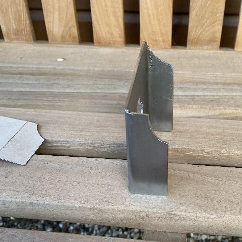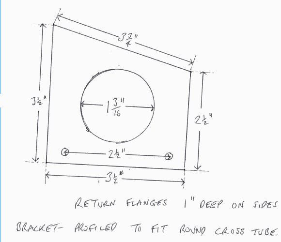 Bend down 90 degrees on the phantom lines. Designed to have 0.040" inside radius, or half the material thickness (or as near zero radius as you like). Do be sure to bend it in the correct direction. Bending will stretch the material length and distort the edges slightly. You might want to touch up the top corners after forming where it will mate with the round frame tube before welding. When installed it should look like first picture at top of page, straight up vertical.