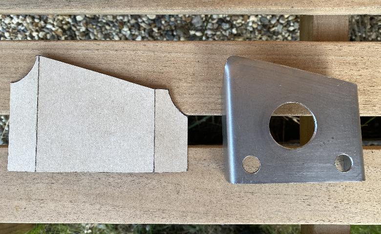 Meanwhile another friend jumped the gun and made a bracket using first pass information with a bit of fettling to make it fit. See pictures below. Close, but no cigar. We can do better. Stand by.