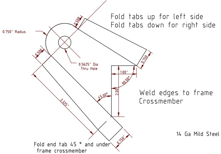 Here we have a drawing of the MGA gearbox rear mount bracket to be welded to the frame , compliments of Bob Shafto in New Hudson, Michigan, USA. The same drawing (or template) can be used for both right hand and left hand brackets by bending the flanges in opposite directions.