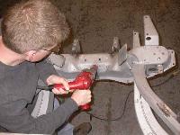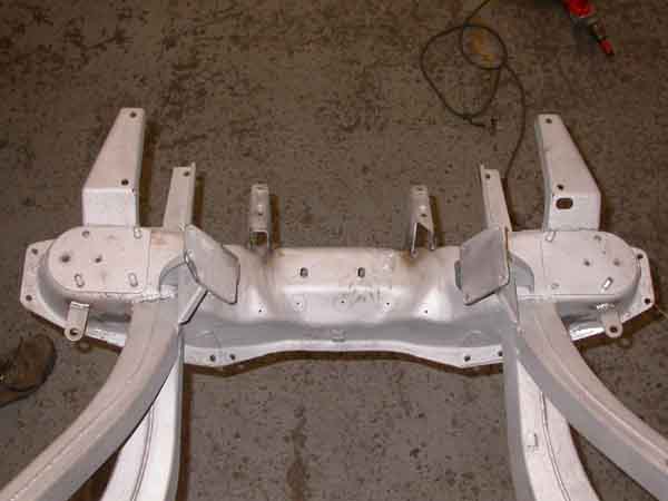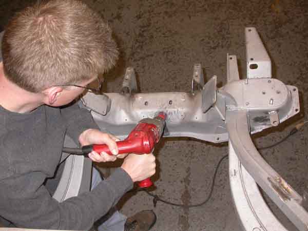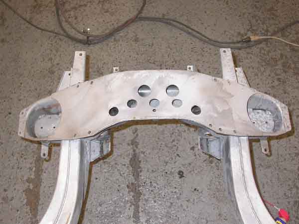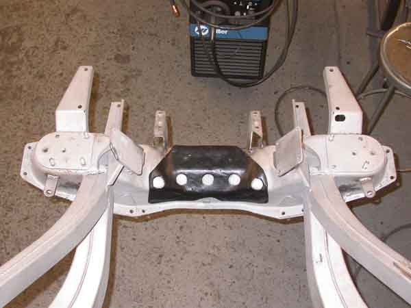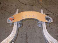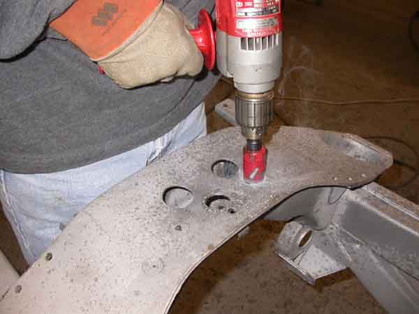 "We needed to duplicate these holes in our crossmember, so a fiberglass pattern was taken of an original Twin Cam crossmember. This enabled us to properly locate the top holes. As the bottom of the crossmember is essentially flat, a paper pattern was made to locate those holes. Once the centers had been marked the holes were drilled with a properly-sized hole saw".