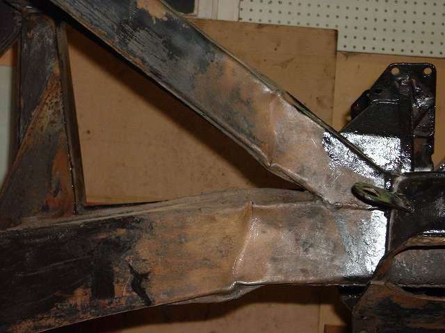 First a preview of the problem, a kink in the frame just aft of the right front suspension mount. This appears to have been bumped solidly on the front and pushed back about 3/4 inch. It didn't look too bad at first glance, but there were concave impressions and some cracks, and this would ultimately require quite a bit of heating and stretching to get back to the original frame dimensions. This sort of work is not an exact science like installing a cylinder head with a torque wrench. Rather one needs to figure things out as the job progresses. It doesn't actually require much experience, but more creativity and patience. Start with a tape measure to take in-line, lateral and diagonal measurements to compare left and right sides of the frame and to determine if something is off center. You can't fix it until you know exactly what's wrong.