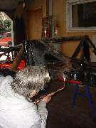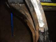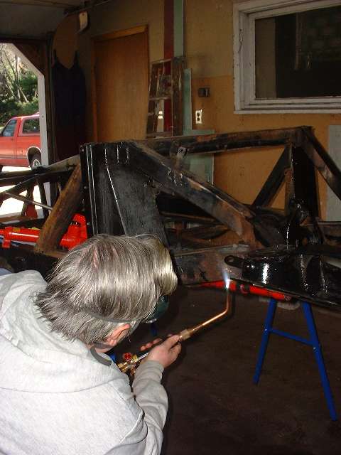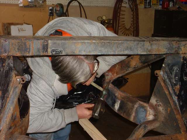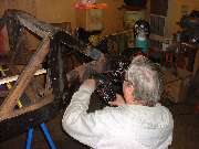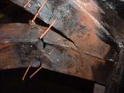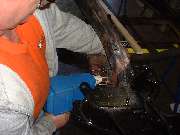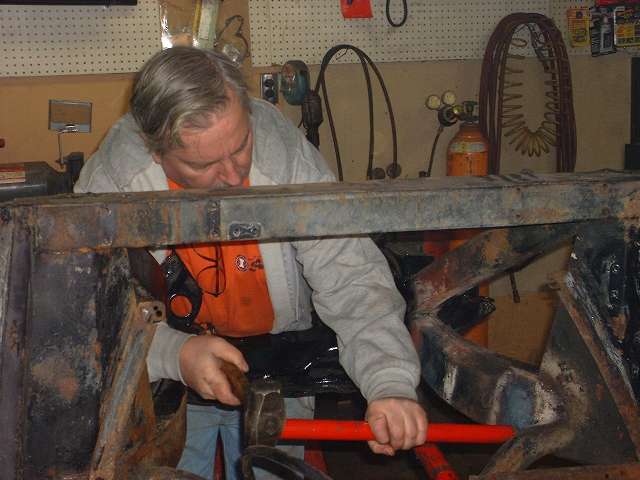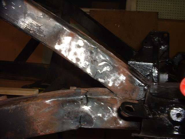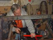 The hydraulic ram is pumped up to high pressure to start, and then the heat is applied to the frame. As the metal begins to glow red and yield, the hydraulic pressure drops a bit, which you can feel by way of reduced force for the pumping handle. At that point you can pump up the hydraulics progressively to keep the metal moving until it goes where you want it. Notice the bright exposed shank of the hydraulic ram in the photos above. Beginning at the left the ram is exposed for about 1-1/2 inches of length. At the right it is exposed for about 2-1/2 inches of length, indicating our success at pushing the frame out by nearly an inch. After allowing the frame to cool for a few minutes the ram was removed, and the steel frame did spring back about 1/4 inch, but ended up just about where it was intended. Having done most of the heating in the area of the depression in the frame rail, as the frame was stretched the depression was also pulled out at least part of the way toward being flush with its original surface point. A couple of cracks were also opened up some, but the remaining dent and cracks will be attended to later in the process.