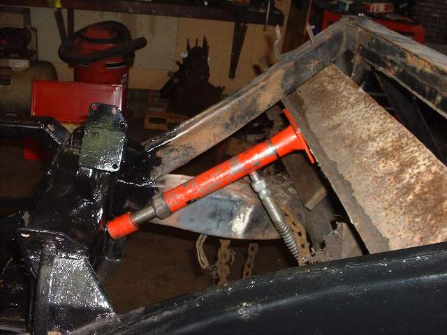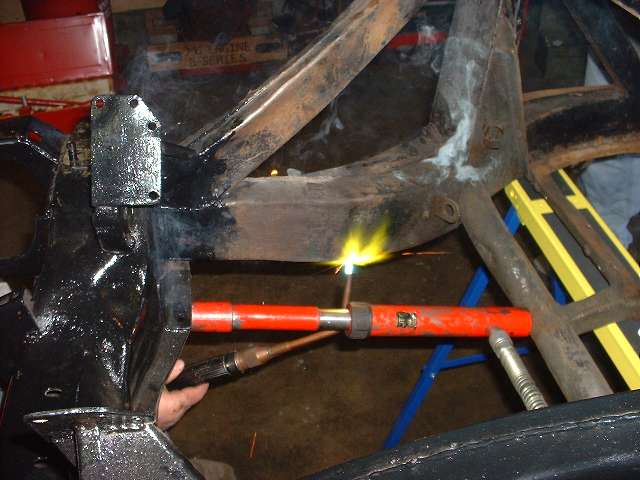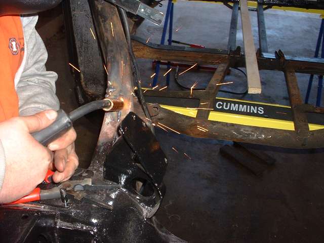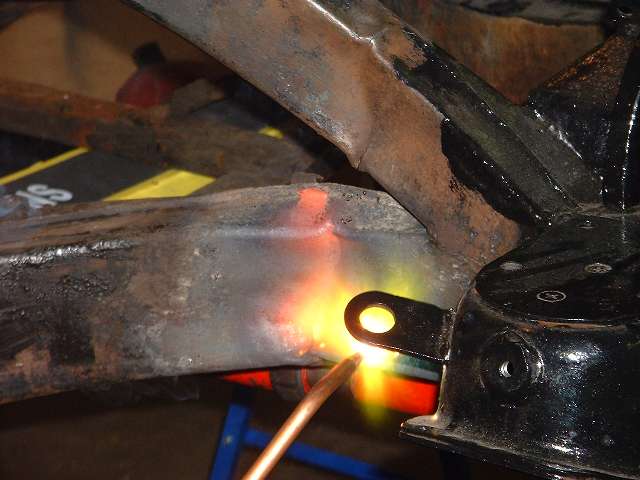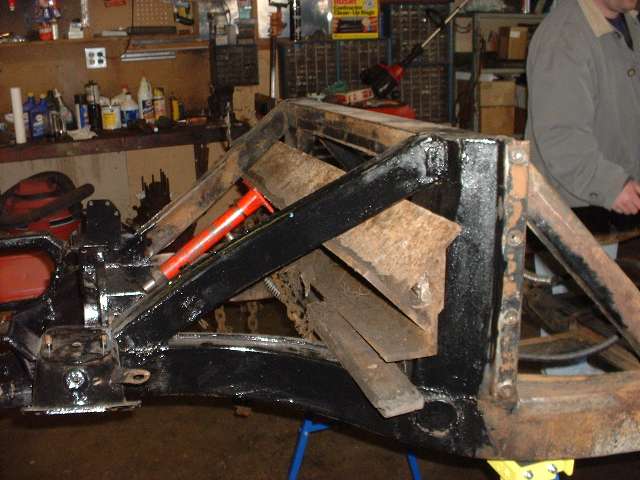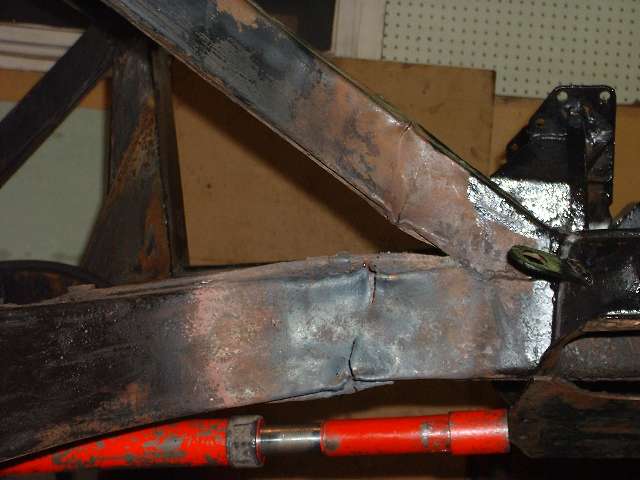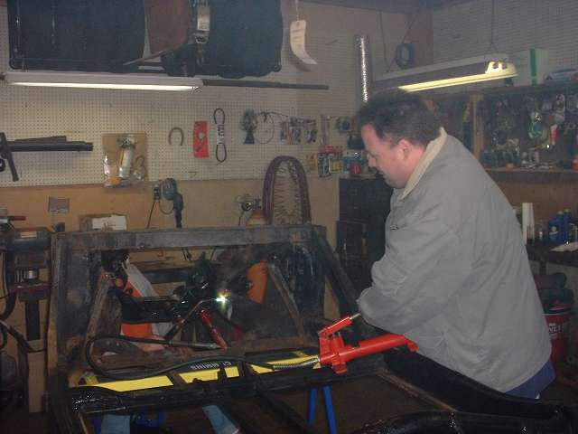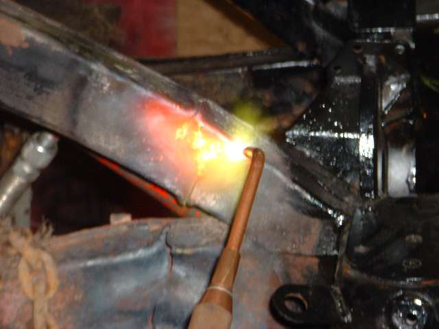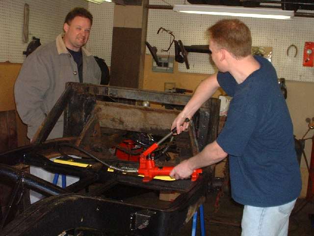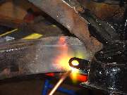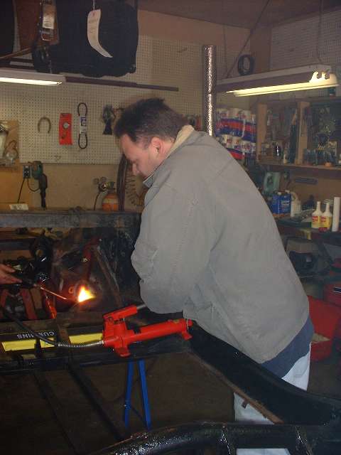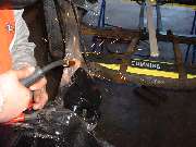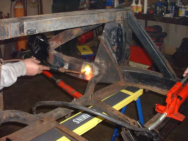 The general technique is to apply force in the direction opposite the original impact to stretch the metal back to where it started from before the impact. The tool of choice in this case is the hydraulic body straightening ram with various end attachments. Then apply enough heat to soften the metal to the point where it will stretch and take a set and not spring back when the force is removed. This requires heating the steel to bright red, and for a large frame section this requires a lot of heat. We started working with the lower leg of the frame because that was the larger section, and if we couldn't move that one the rest would be for naught.