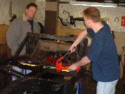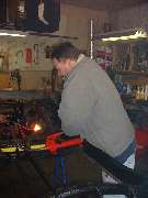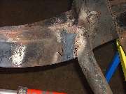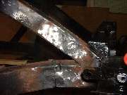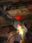As the kink and dent were being pulled out of the top rail some cracks were opening up here as well, but noting we couldn't attend to later. As the metal was hot and stretching, just a light tap on the inside surface with a two pound hammer was enough to remove the excess bow from the rail and increase the length considerably. Some more heat and a few more strokes of the pump, and the top rail was back to normal length again.
