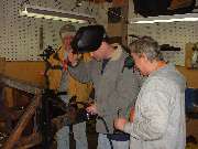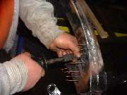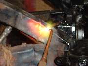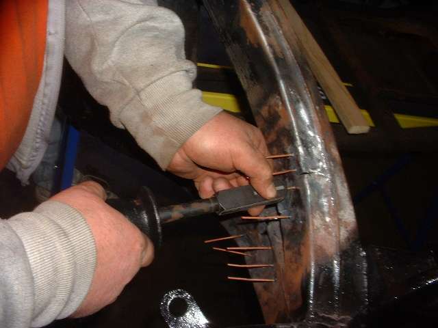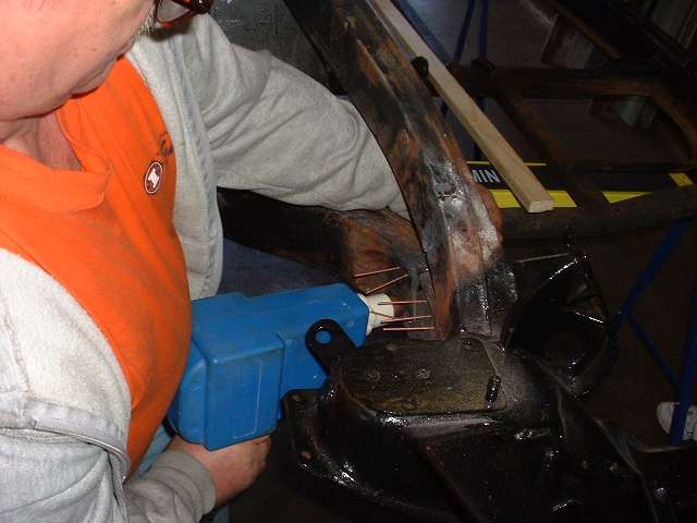 The next special tool to make an appearance was the hand held stud welder. This has a spring loaded conical center power tip to hold the stud, and a cylindrical copper grounding contact. The "studs" are copper plated steel nails. Insert a stud into the nose collet of the welder, press firmly against the bare steel surface to get good electrical contact, squeeze the trigger for a couple of seconds, and the stud is instantly spot welded to the surface. This tool works on any household 115 VAC 15 amp outlet. Weld several studs into the low spots at intervals of an inch or so, giving the frame the appearance of a porcupine.