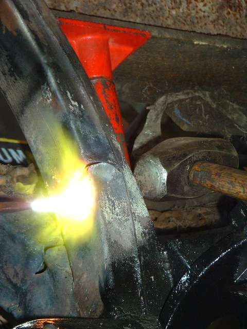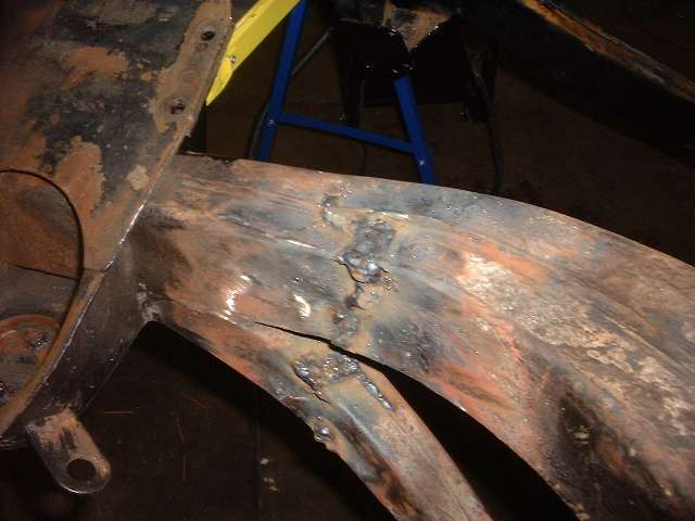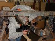 Then out came the MIG welder to weld up all the cracks and gaps in the frame. Weld some here, turn it over and weld some there. Truth be known, the beauty of the welds was not something to write home about, but they are structurally solid, and some work with the angle grinder goes a long way towards improving the appearance before painting.