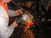 Finished with the heating and stretching, it was time for some cosmetic work. Using a cross peen body hammer for a punch and tapping with the 2 pound hammer, we soon made some considerable improvement in the position and straightness of the top and bottom flanges and weld seams. Having a couple more tricks to go, it was time to sand off some paint and rust to expose bare metal for a good electrical contact.