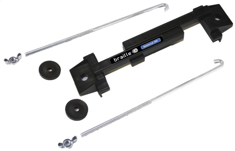 clamp centered across the top of the battery.When I did this the J-bolts went in the same holes in original position extending straight upward, and it worked out well. This Braille 3188 model is my favorite, as long as the J-bolts can go straight down on both sides, and there is space across the center on top of the battery. Sturdy FRP (Fiberglass Reinforced Plastic), adjustable width, strong and durable, about $20 for the whole kit. -- Excuse the Vice-Grip. It was temporarily holding a broken cable terminal clamp. And the top ends of the J-bolts were trimmed down later.